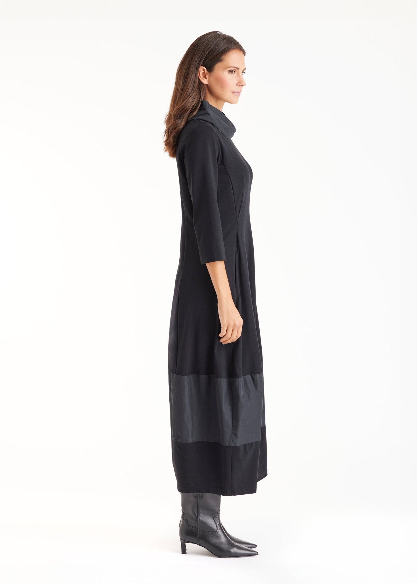 The GIROBO midi dress stands out without being too overbearing. The gentle O-shape skillfully plays with volume without obscuring the waist. The material mix of soft stretch viscose and patch taffeta adds excitement and character to the design. The sophisticated stand-up collar gives it a casual yet unique look.