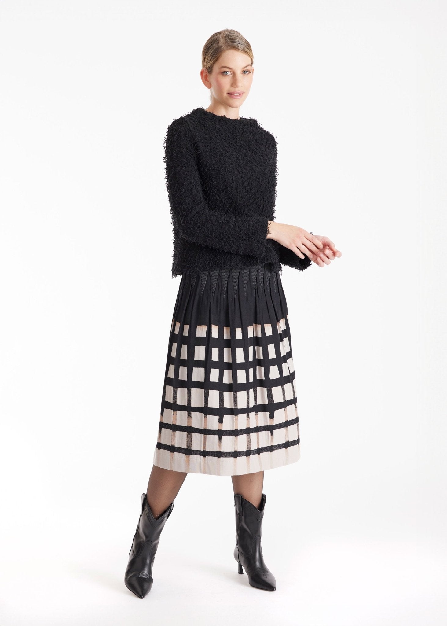 Our LONGERO-W skirt, made from a sophisticated jacquard fabric with a unique design, is back on trend for the winter season. Featuring a midi-length silhouette and a comfortable elastic waistband, it skillfully completes your special look. Its distinctive pattern adds a special touch to any outfit. Thanks to its one-size-fits-most design, it's a perfect fit for sizes 36-42.