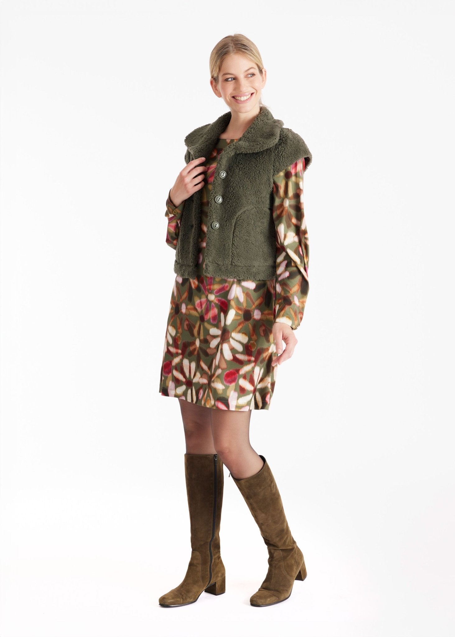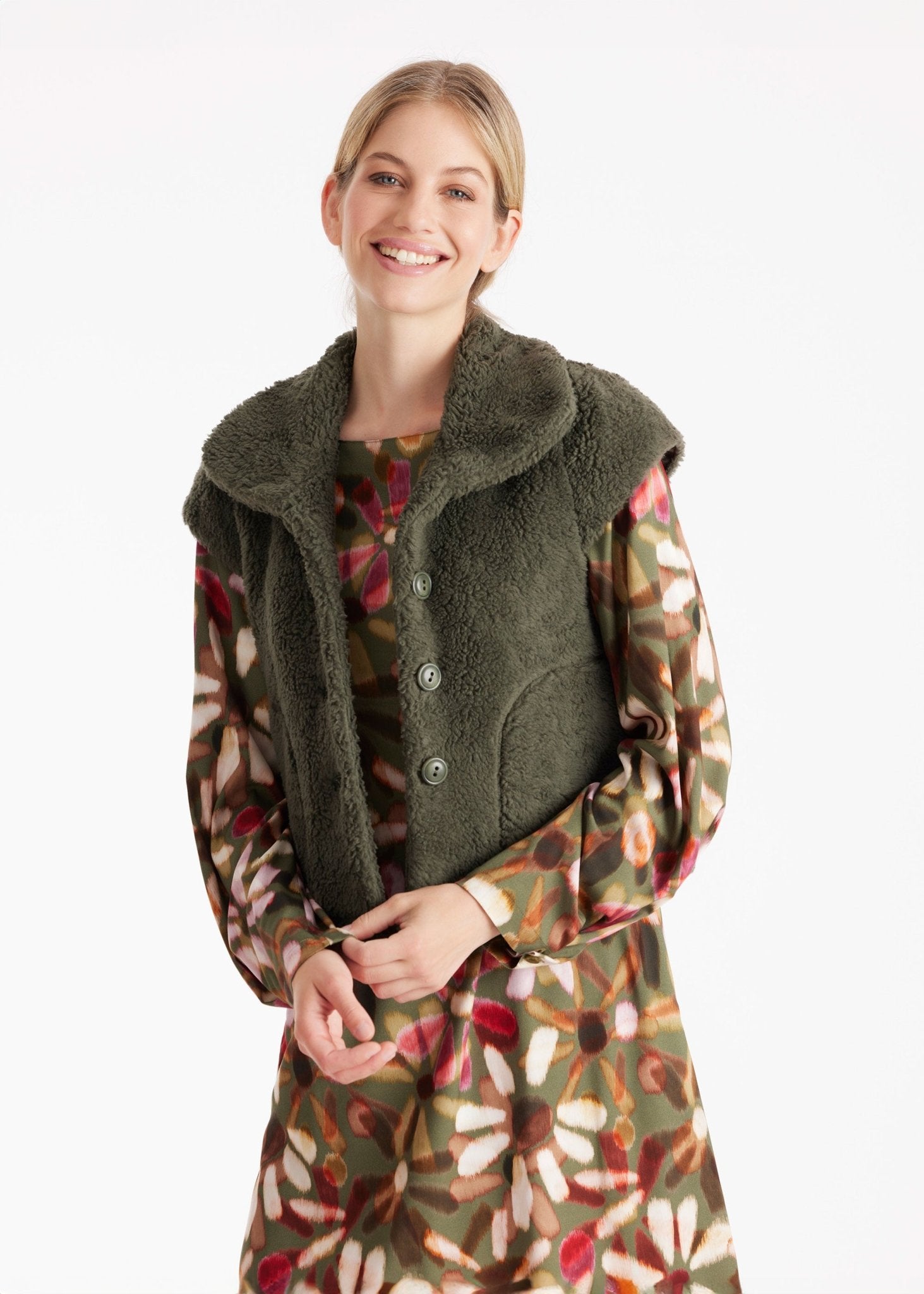 The WESPUSA vest, made from teddy fabric, is ideal as a stylish layer for transitional days or as an accent piece over simple basics. Crafted from soft cotton and featuring short sleeves, it combines comfort with modern chic. The A-line silhouette is flattering, while functional side pockets and a full button placket complete the design.